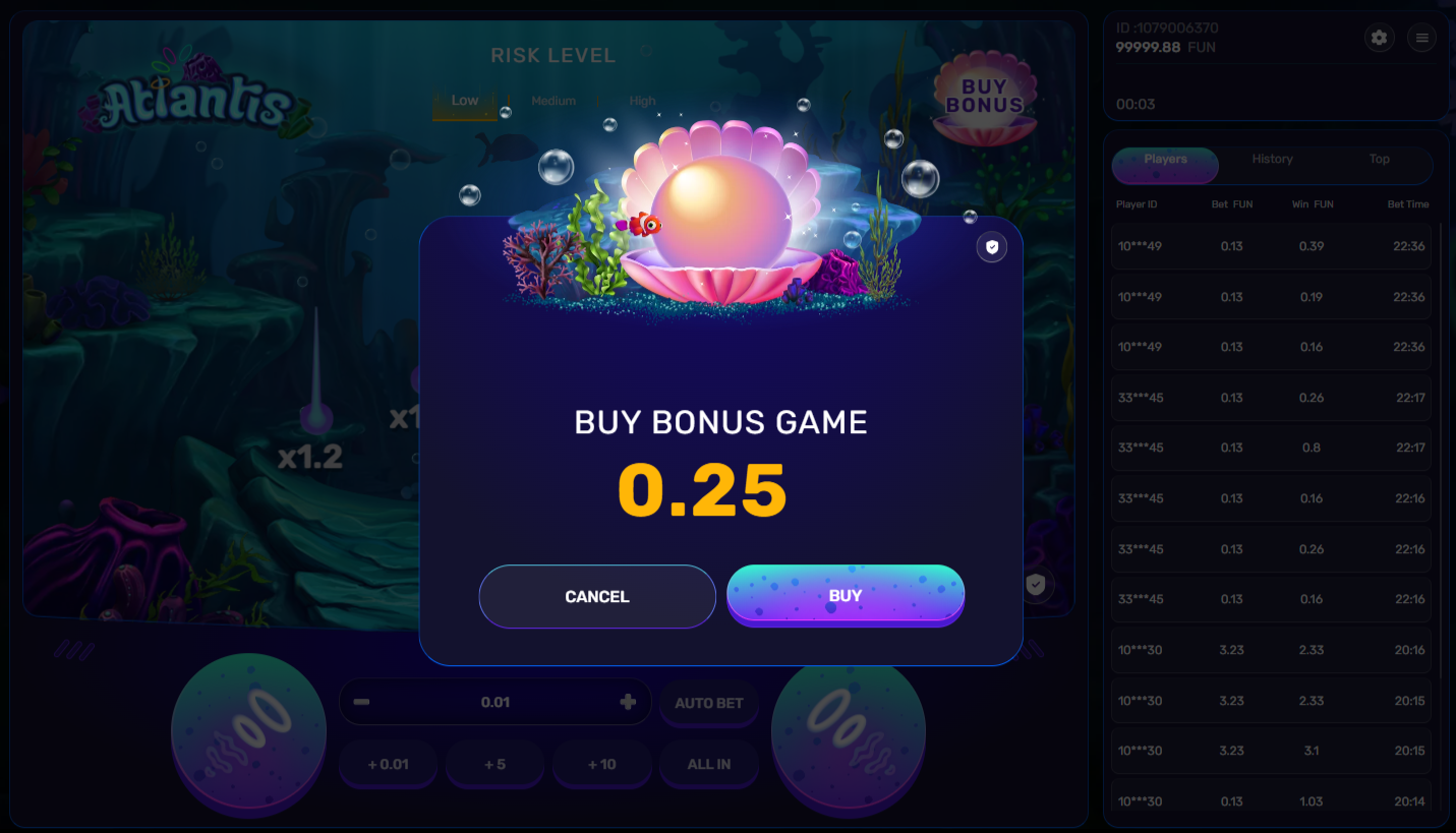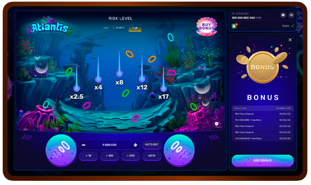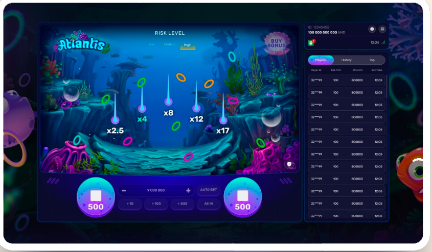 Atlantis обещает захватывающий игровой процесс: игроки погружаются глубоко под поверхность океана, чтобы собрать кольца и обнаружить спрятанные сокровища. Для этого им нужно выбрать желаемый уровень риска, указать сумму ставки и нажать соответствующую кнопку ставки, чтобы увидеть, как из фиолетовых кораллов появляются три кольца.