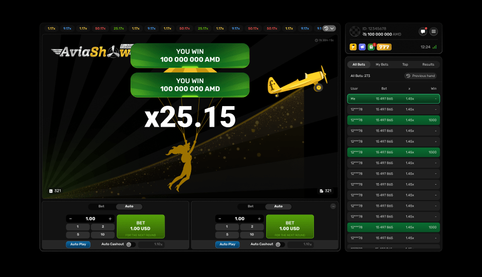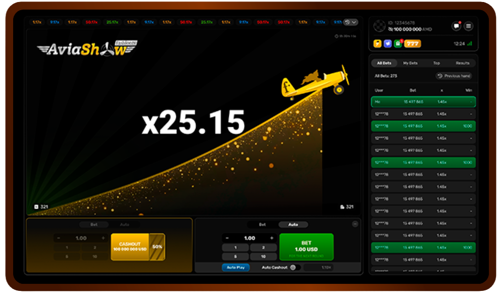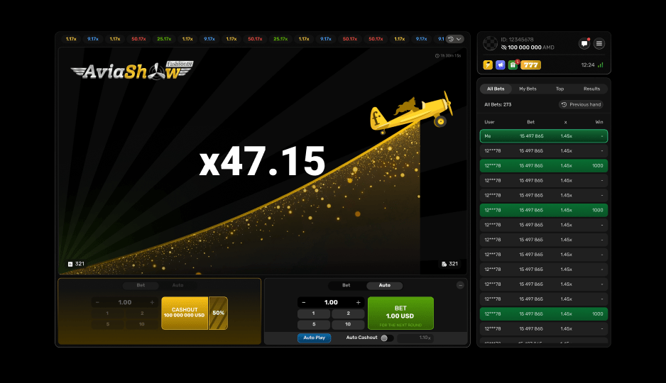Aviashow — это многопользовательская игра в реальном времени, в которой игроки делают ставки, взлетают и наблюдают, как их самолет поднимается все выше и выше, а множители растут. Задача проста: обналичить выигрыш до того, как самолет исчезнет.