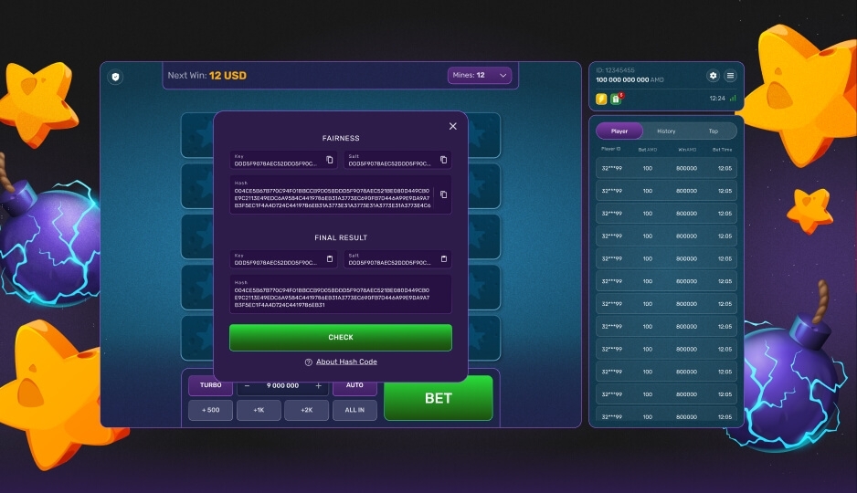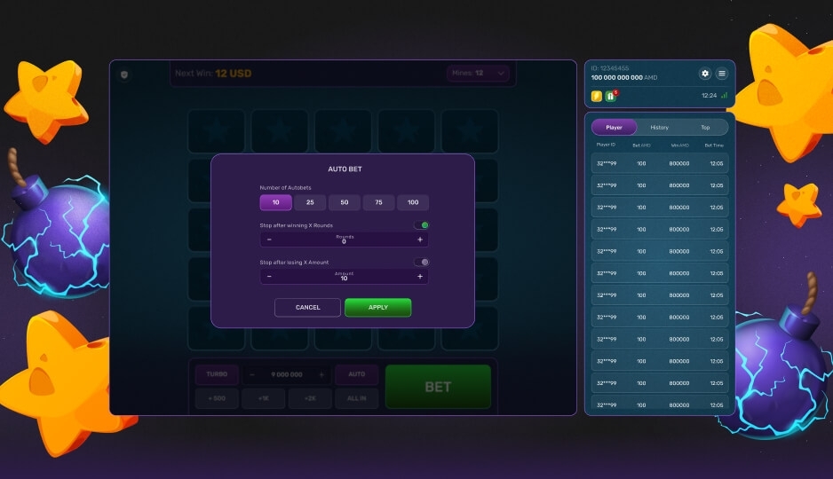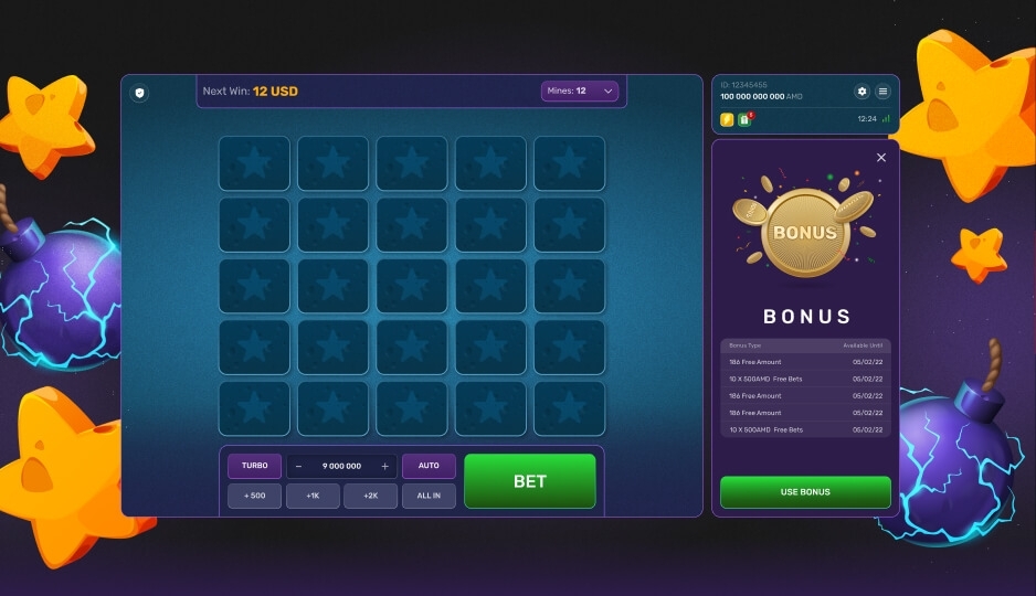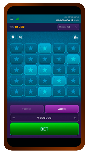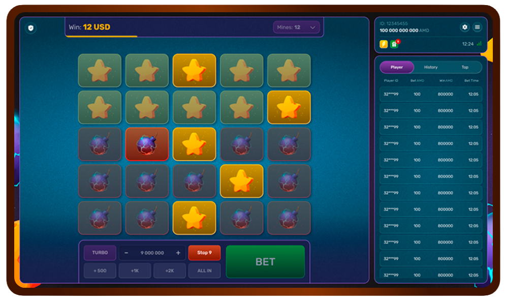 Turbo Mines — это новая увлекательная игра, в которой игрокам нужно открывать ячейки со звёздами, избегая при этом спрятанных мин. Чтобы начать игру, игроки могут выбрать количество мин (от 1 до 24), сделать ставки, а затем открывать ячейки, чтобы узнать, что находится под ними.